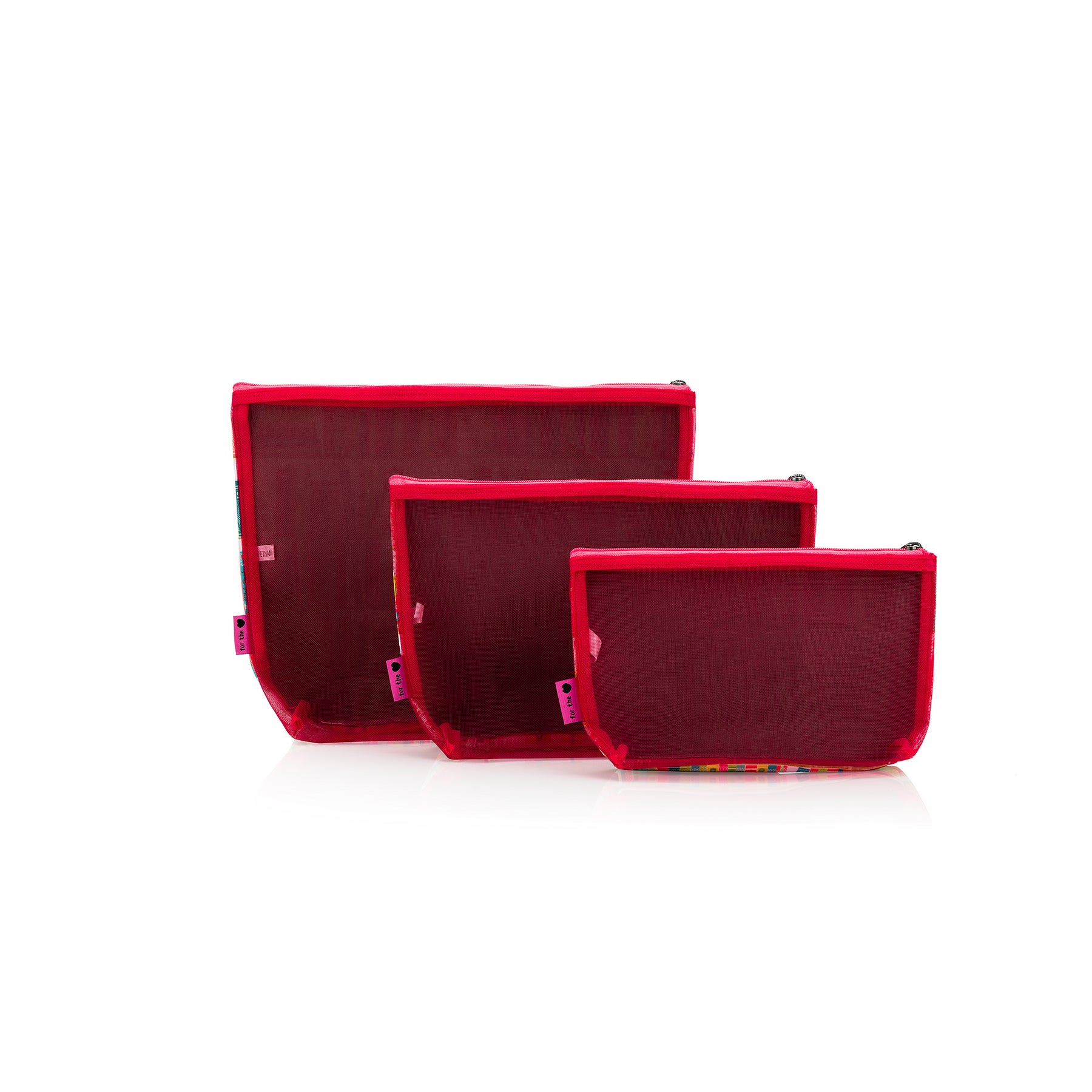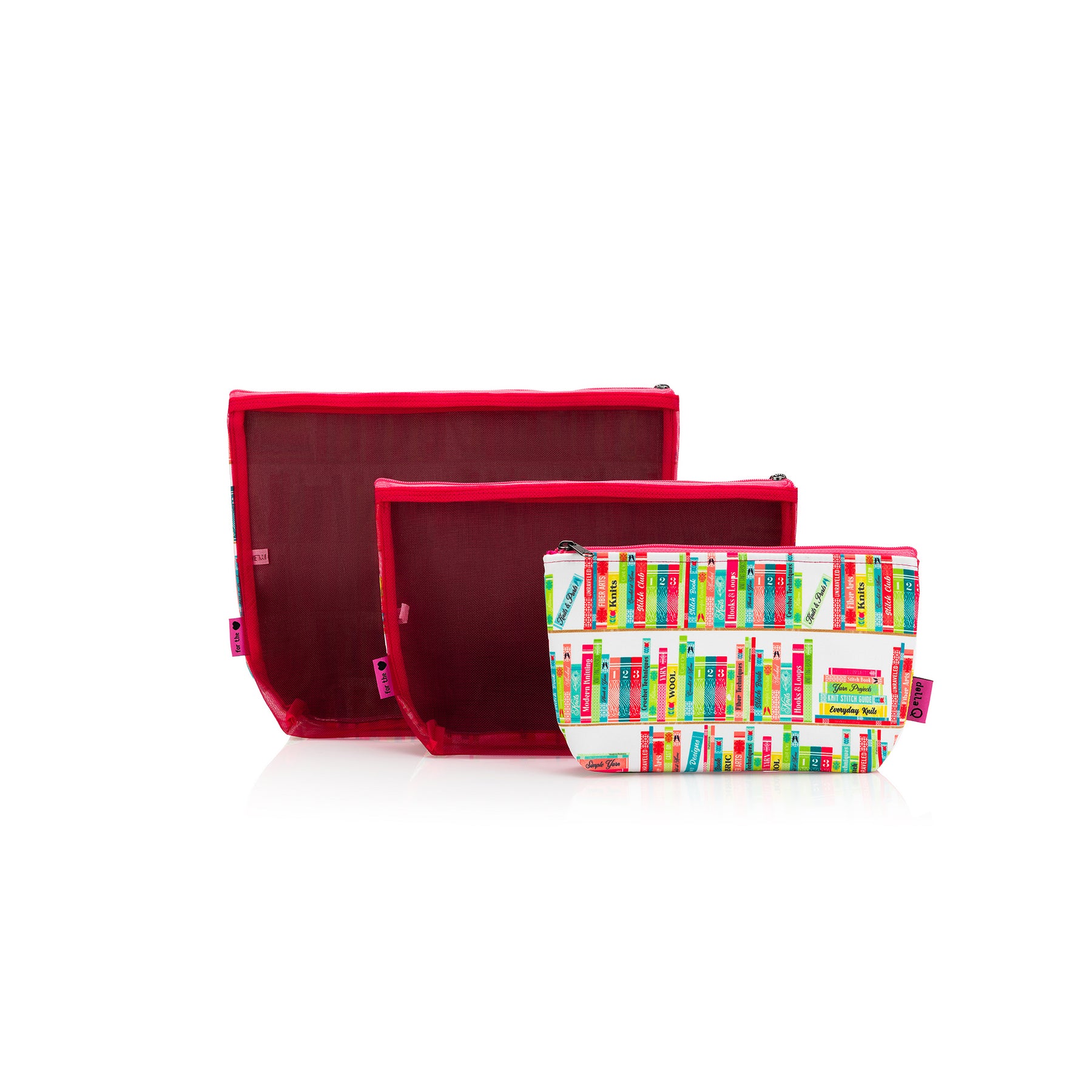 The Mesh + Zip collection is a matching set of three nesting zipper pouches. Each bag has fabric on one side and mesh on the other. The sets include three pouches that nest perfectly inside one another to save space. The small size is great for notion storage while the large pouch is big enough for a small 1-3 skein project.